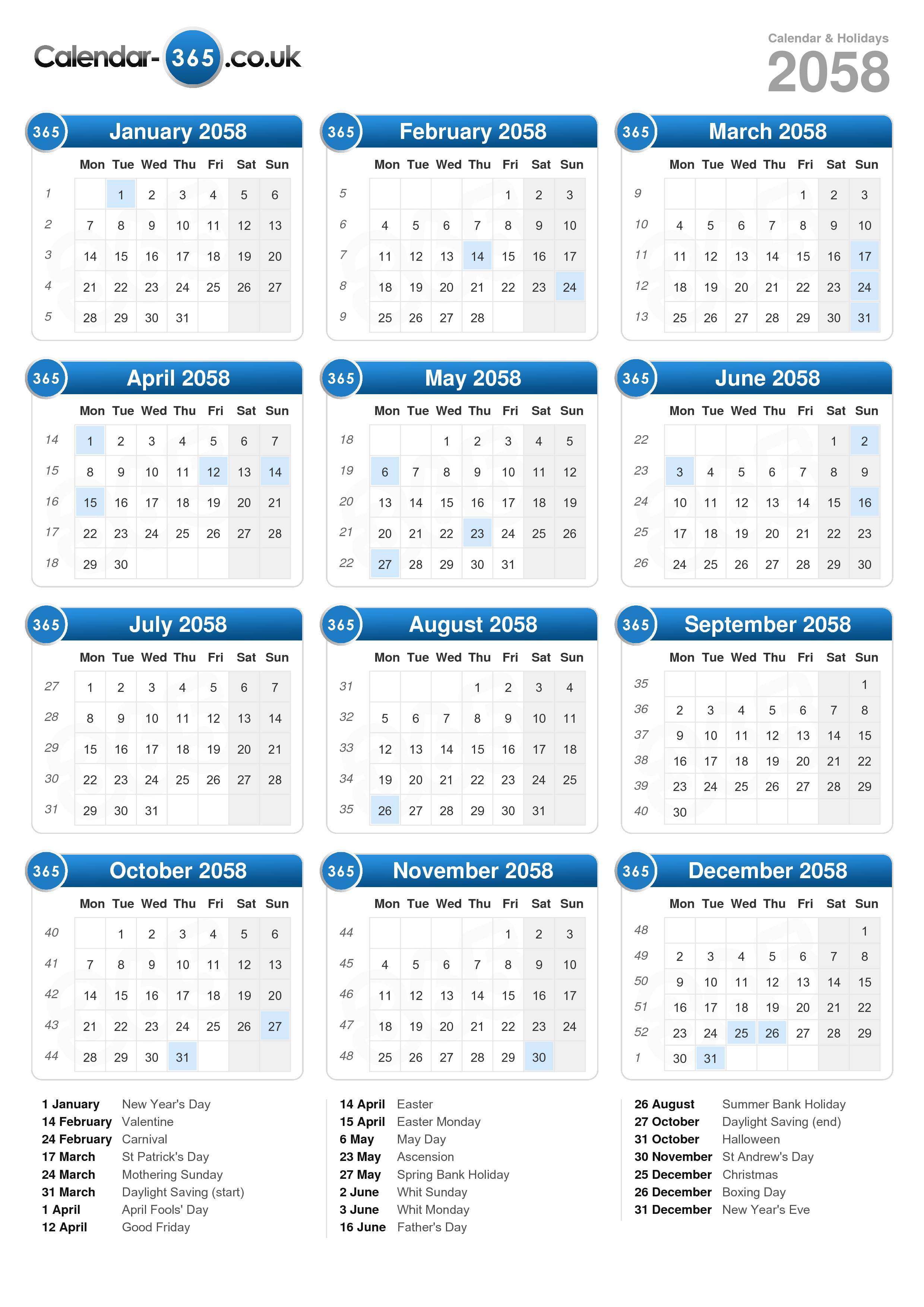 Download the printable calendar 2058 with holidays.
