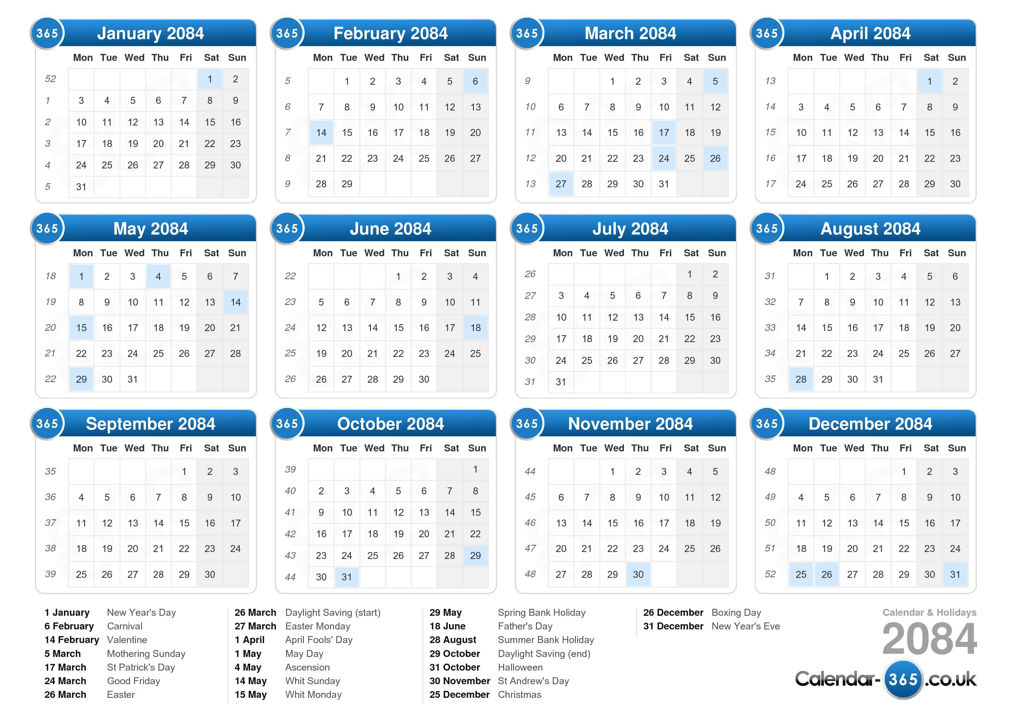 The calendar 2084 is automatically generated and can always be viewed online. Within the above calendar you can also click on the month to see the month calendar for 2084 including all holidays and week numbers. In the menu above it's additionally possible to view the dates of the daylight saving for the next 20 years in the UK, leap years, current lunar phase in 2084, lunar calendar 2084, the world clock and some more options.Check also the Calendar 2085.