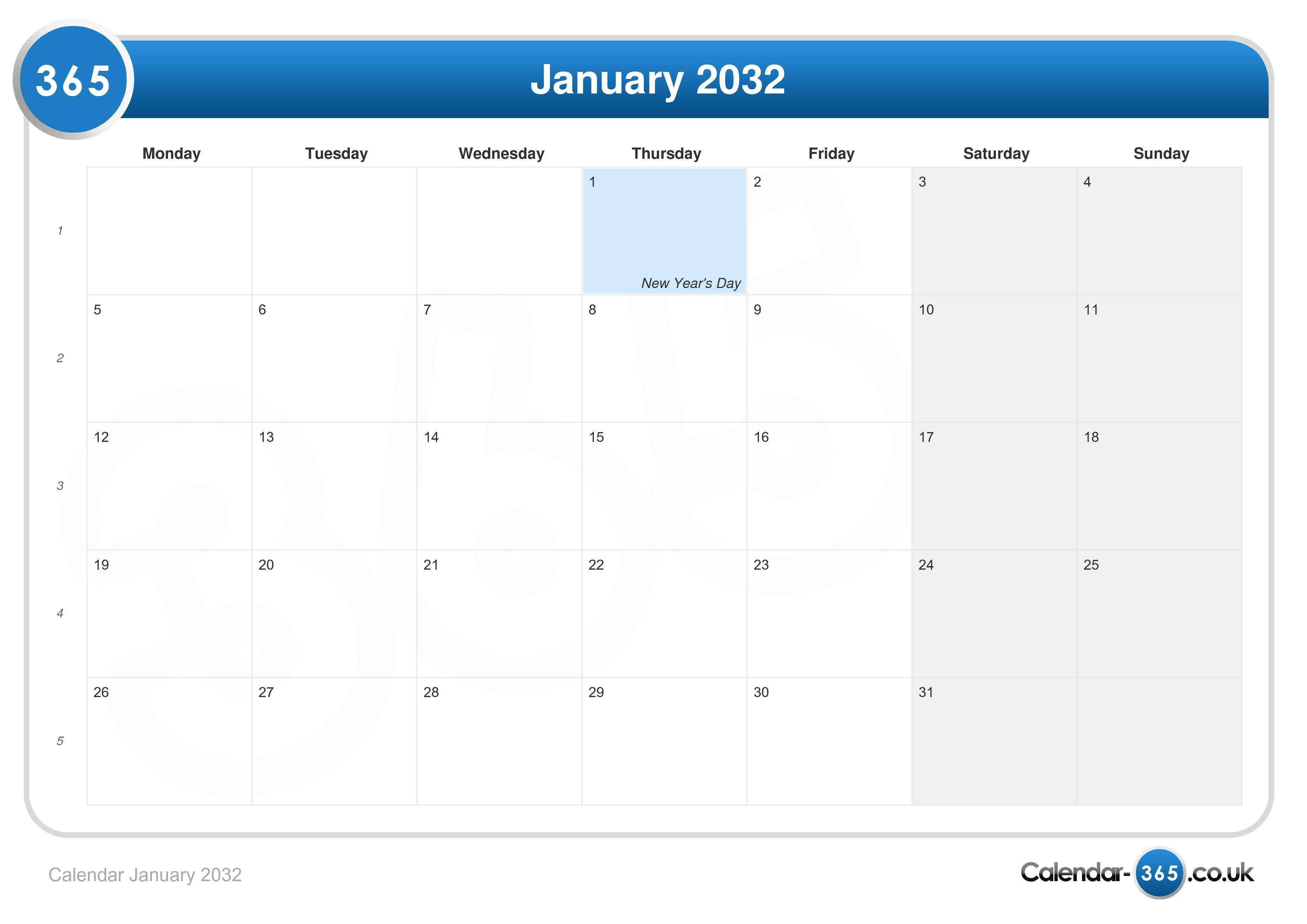 This january 2032 calendar is very useful for a lot of different purposes, for example planning your vacation.