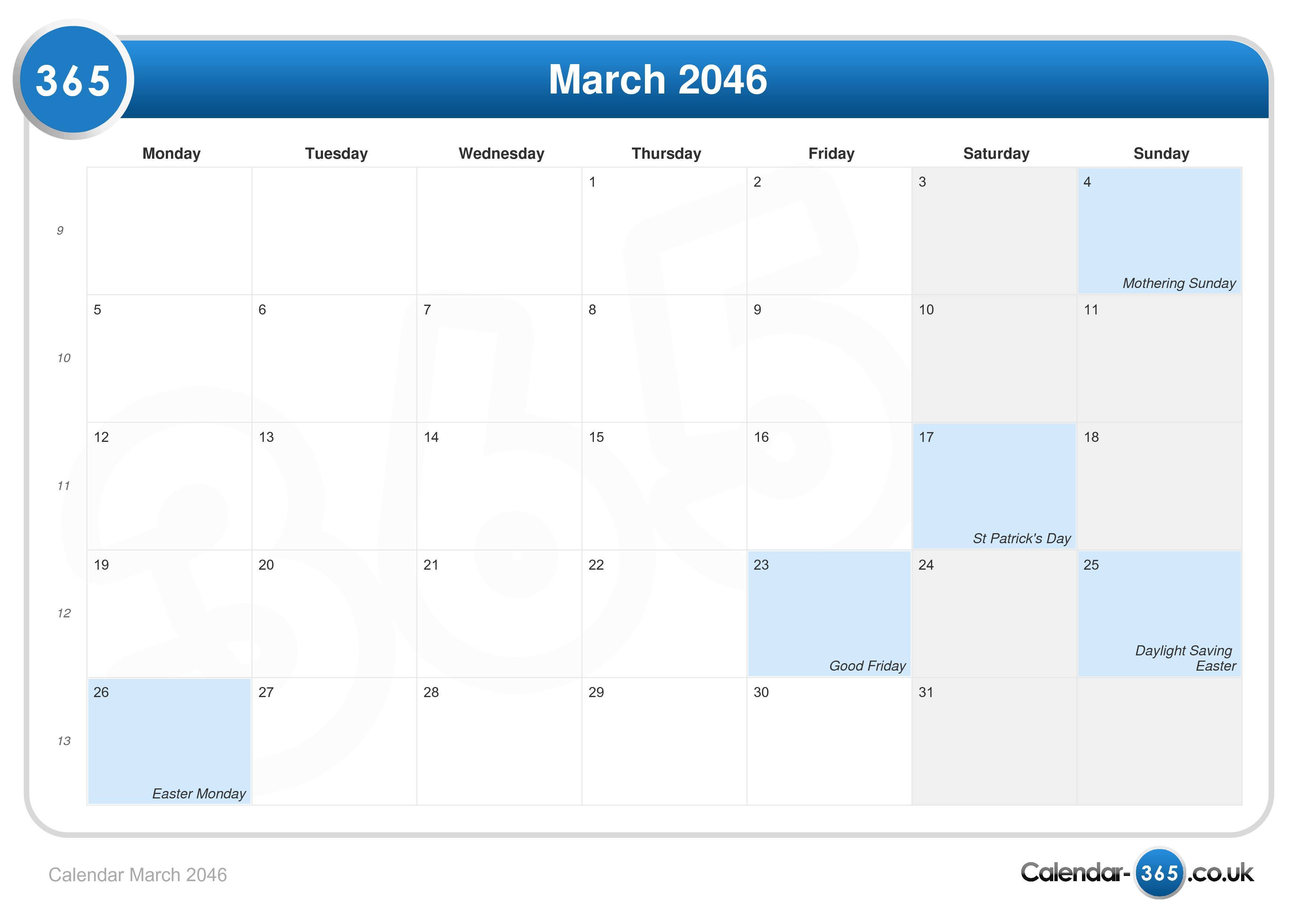 See below the month calendar of March 2046 including week numbers.| 4 March | Mothering Sunday |